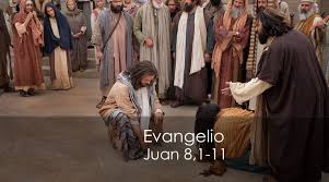 Juan 8, 1-11 “Jesús escribía en el suelo… se incorporó y dijo: El que esté libre de pecado que arroje la primera piedra… Mujer, nadie te ha condenado… tampoco yo te condeno… Vete y no peques más”.