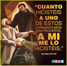 «Entonces dirá el Rey a los de su derecha: "Venid, benditos de mi Padre, recibid la herencia del Reino preparado para vosotros desde la creación del mundo. Porque tuve hambre, y me disteis de comer; tuve sed, y me disteis de beber; era forastero, y me acogisteis; estaba desnudo, y me vestisteis; enfermo, y me visitasteis; en la cárcel, y vinisteis a verme."»