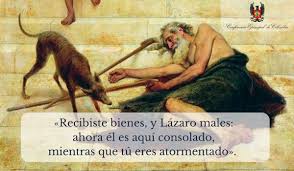 «Pero Abraham le dijo: "Hijo, recuerda que recibiste tus bienes durante tu vida y Lázaro, al contrario, sus males; ahora, pues, él es aquí consolado y tú atormentado. «Replicó: "Con todo, te ruego, padre, que le envíes a la casa de mi padre, porque tengo cinco hermanos, para que les dé testimonio, y no vengan también ellos a este lugar de tormento." Le dijo Abraham: "Tienen a Moisés y a los profetas; que les oigan." Él dijo: "No, padre Abraham; sino que, si alguno de entre los muertos va donde ellos, se convertirán." Le contestó: "Si no oyen a Moisés y a los profetas, tampoco se convencerán, aunque un muerto resucite."»
