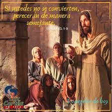 En este mismo tiempo estaban allí algunos que le contaban acerca de los galileos cuya sangre Pilato había mezclado con los sacrificios de ellos. Respondiendo Jesús, les dijo: ¿Pensáis que estos galileos, porque padecieron tales cosas, eran más pecadores que todos los galileos? Os digo: No; antes si no os arrepentís, todos pereceréis igualmente. O aquellos dieciocho sobre los cuales cayó la torre en Siloé, y los mató, ¿pensáis que eran más culpables que todos los hombres que habitan en Jerusalén? Os digo: No; antes si no os arrepentís, todos pereceréis igualmente.