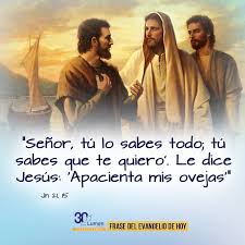 Jn 21,15-19. Jesús le dice a Pedro: "Apacienta mis ovejas. Te lo aseguro: cuando eras joven, tú mismo te ceñías e ibas adonde querías; pero, cuando seas viejo, extenderás las manos, otro te ceñirá y te llevará adonde no quieras." Dicho esto, añadió: "Sígueme."